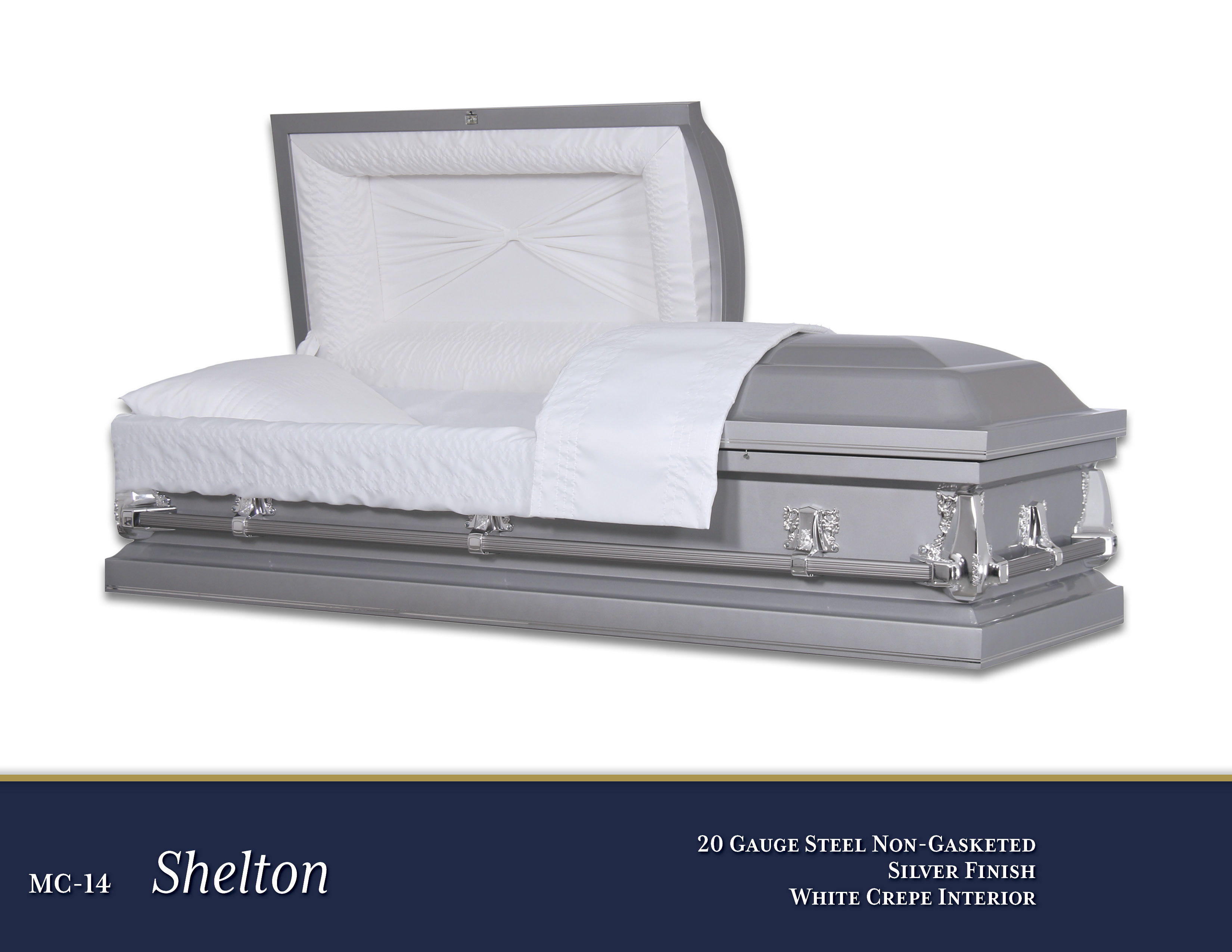 MC-14 Shelton$2,895.00Price20 Gauge Steel Non-GasketedSilver FinishWhite Crepe InteriorOpen Shareable Image