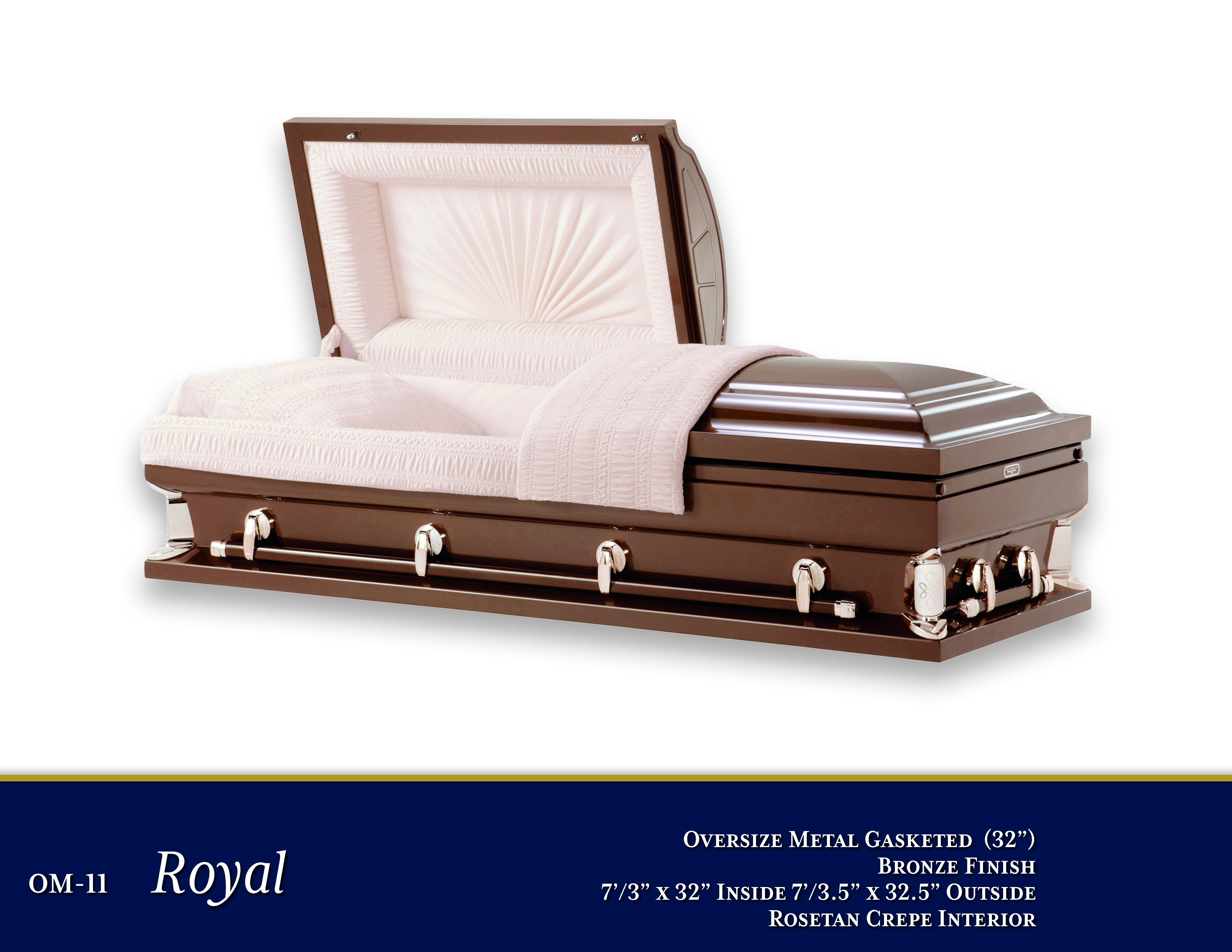 OM-11 Royal 32"$4,595.00PriceOversized Metal GasketedBronze Finish7'3" x 32" Inside - 7'3.5" x 32.5" OusideRosetan Crepe InteriorOpen Shareable Image