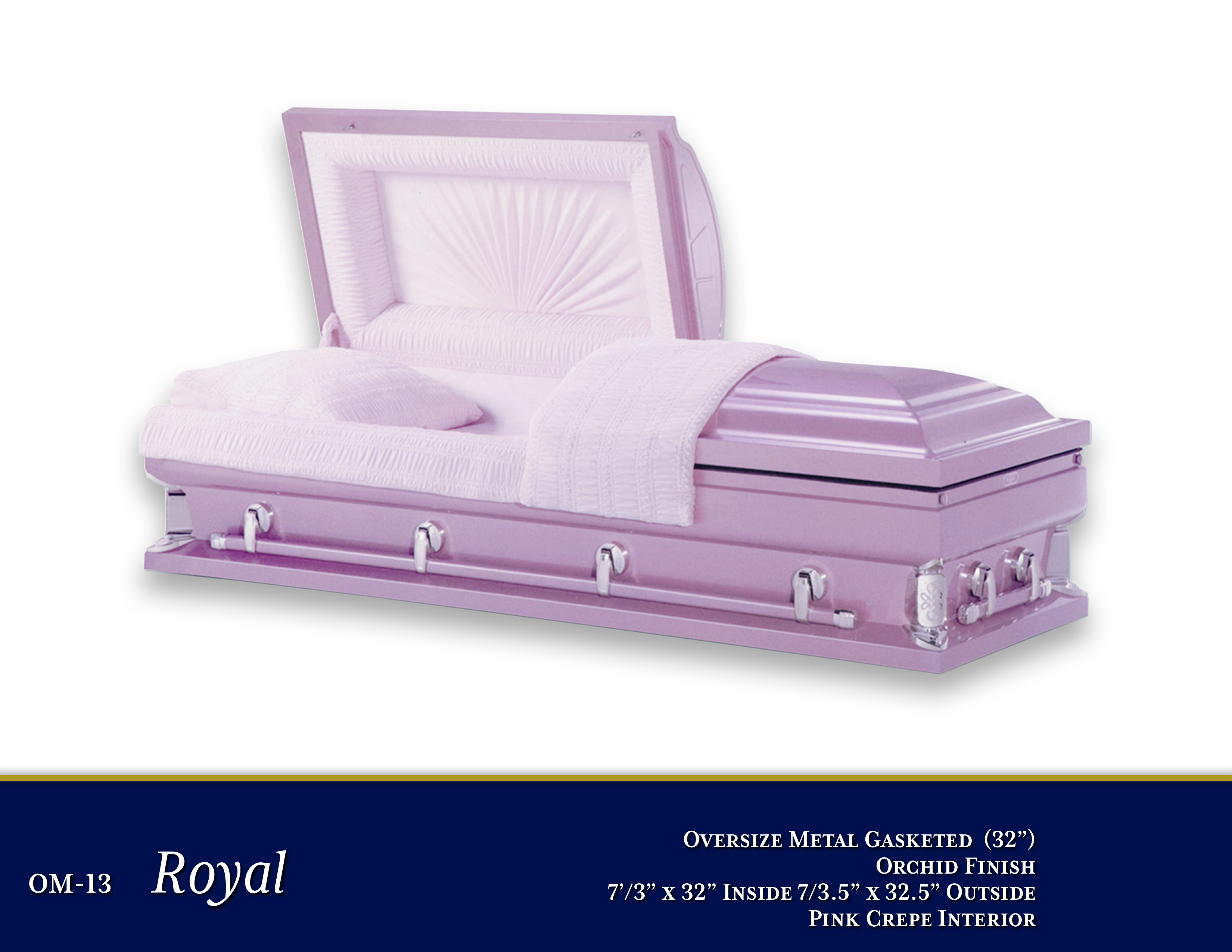 OM-13 Royal 32"$4,595.00PriceOversized Metal GasketedOrchid Finish7'3" x 32" Inside - 7'3.5" x 32.5" OusidePink Crepe InteriorOpen Shareable Image
