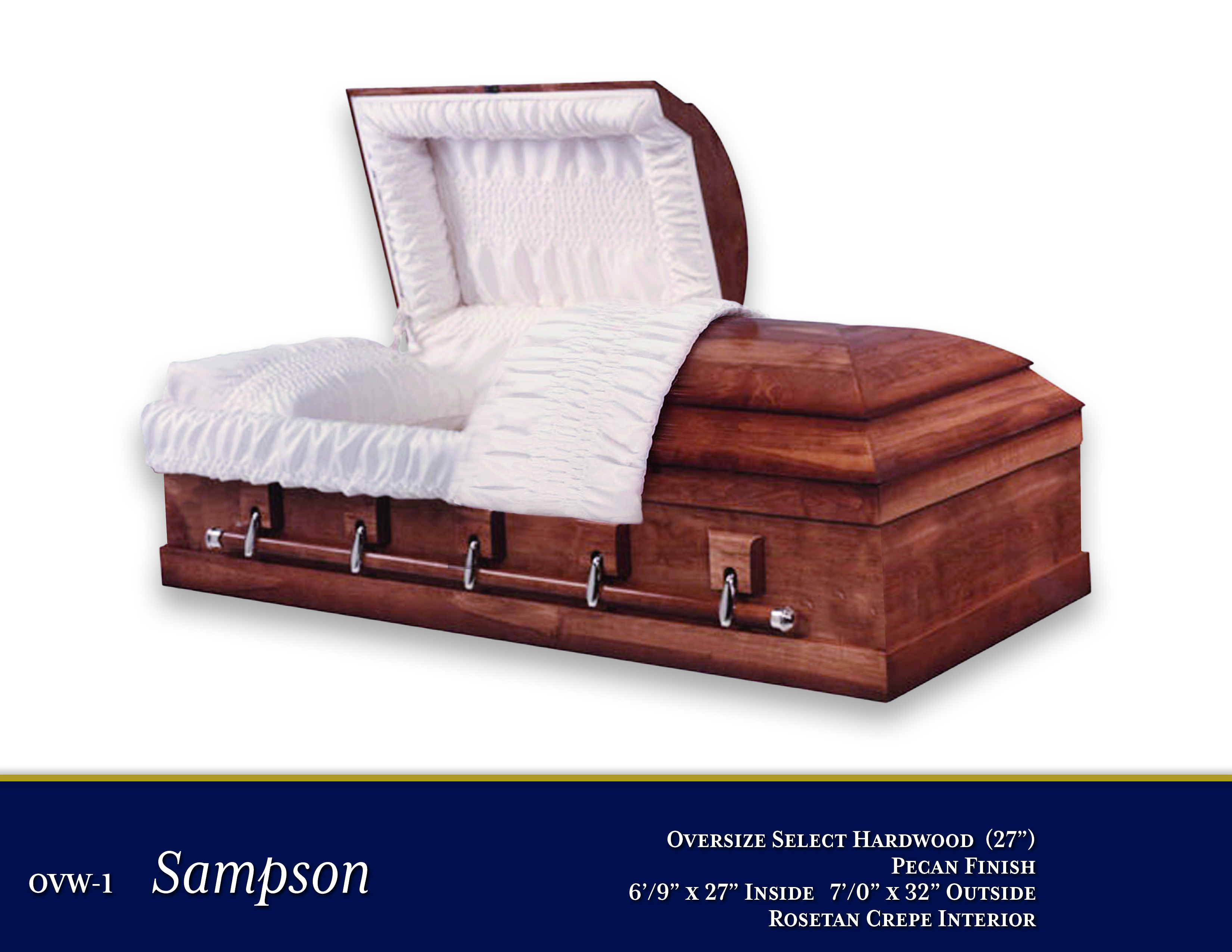 OVW-1 Sampson 27"$4,195.00PriceOversized Select HardwoodPecan Finish6'9" x 27" Inside - 7'0" x 32" OutsideRosetan Crepe InteriorOpen Shareable Image